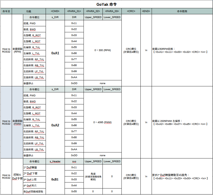 目前ros32開放3種UART命令,每個參數欄位(uint_8)。