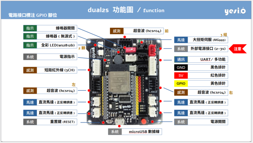 dual2s(2025年版)是以常見DC電機、伺服電機為專題設計導向的開發板,以ESP32為可程式控制單元。dual2s提供下列12種主要功能/特色: