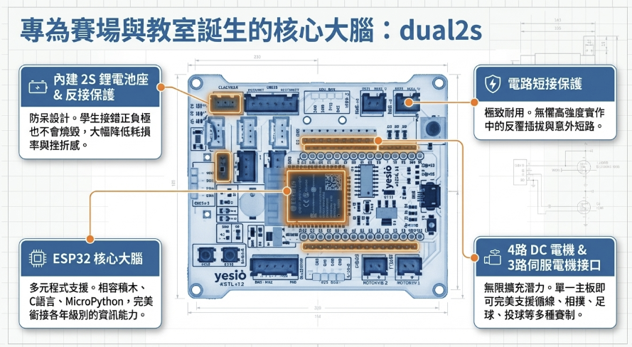 dual2s 函式庫整合了低功耗藍牙通訊技術,讓開發者能直接使用標準的 PS3 遊戲搖桿來控制機器人。透過事件驅動(Event-driven)的機制,當搖桿的按鍵被按下或類比搖桿位移時,系統會自動觸發對應的處理函式,大幅簡化了主迴圈(loop)的撰寫難度。本範例展示了如何設定連線回呼、讀取全按鍵狀態以及獲取精確的類比座標值。